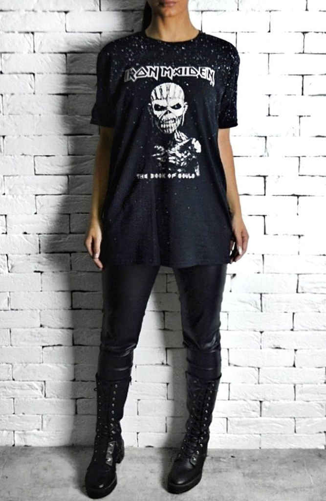Iron Maiden printed logo crew neck t-shirt, with rolled sleeves and an oversized fit, wear leggings for a casual look or dress up with a leather pencil skirt and heels,