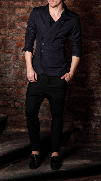 The bespoke Alex Christopher Suit Blazer is crafted in a navy blue with a fine red pinstripe finished with oversized lapel detailing. Lined with satin the blazer features lightly padded shoulders.