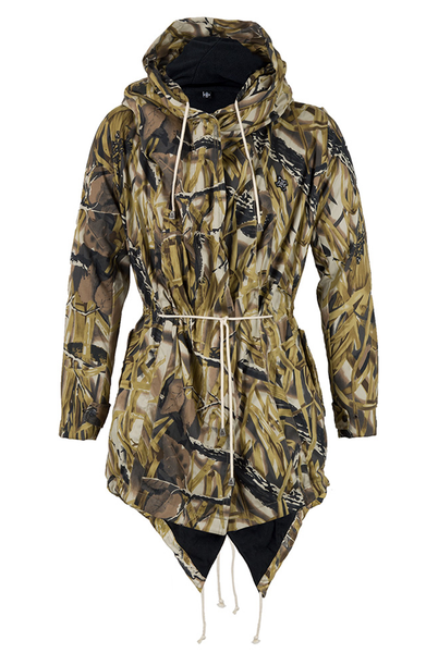Detailed with a double zip fastening and drawstring hood and on the waist which can be adjusted.