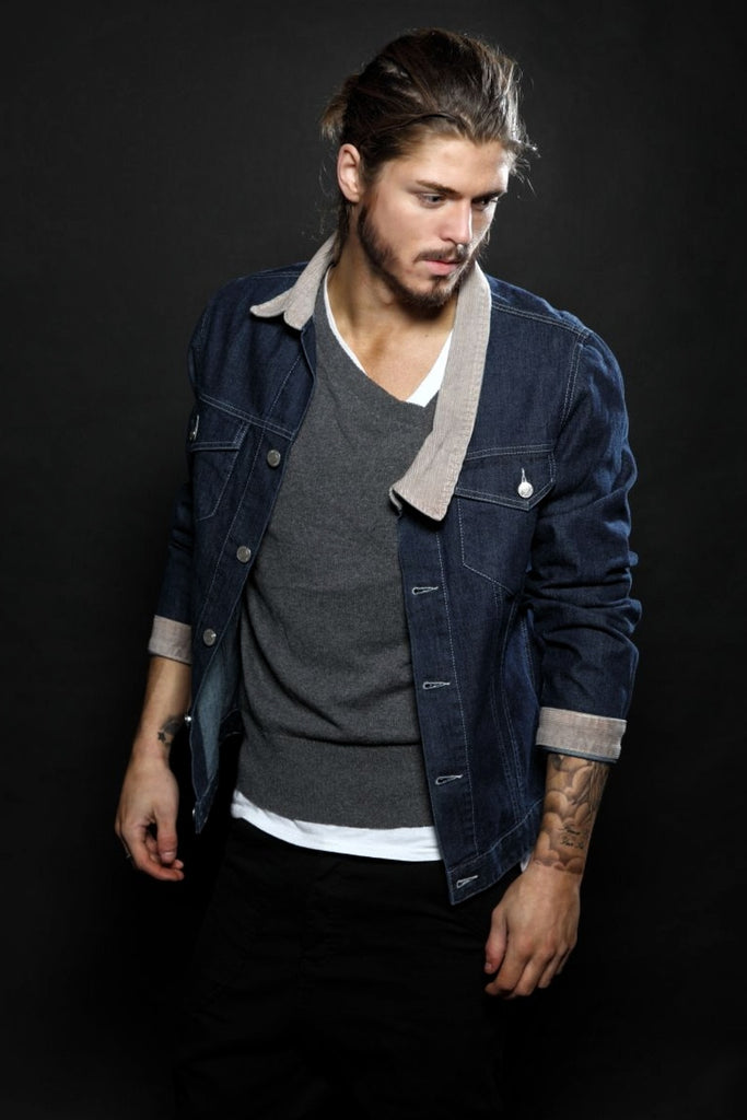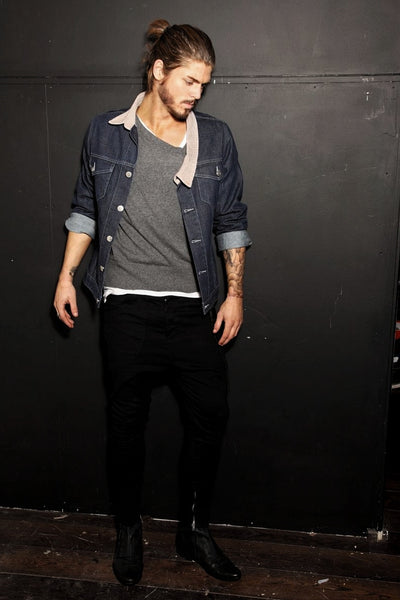 - This denim jacket features button up fastening, corduroy collar and asymmetric v neck style neckline.